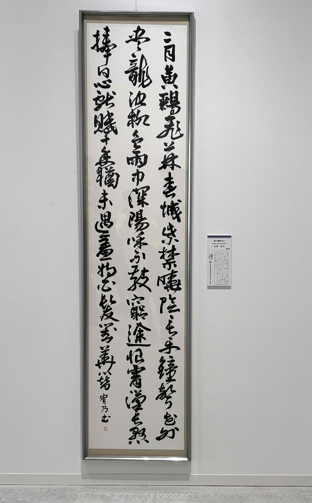 11月22日(土)、鳥取県立美術館で行われた、第45回近畿高等学校総合文化祭鳥取大会書道部門に、本校書道部2年、岩嵜宥乃さんが参加しました。岩嵜さんは、創作で「闕下贈裴舎人(けっかにてはいしゃじんにおくる)」という漢詩を2尺8尺(縦240㎝×横62㎝)の紙に書き、出品しました。