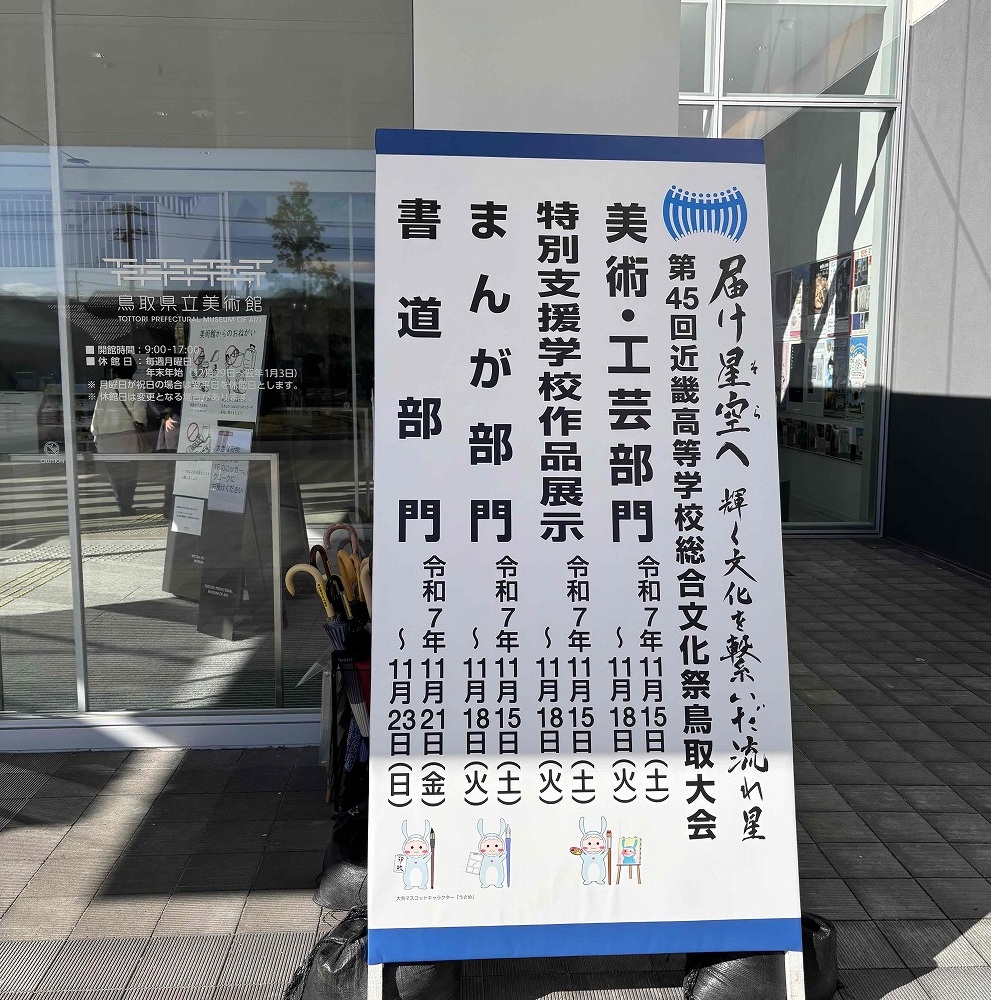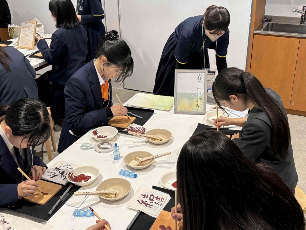 午前は、今年3月にできたばかりの鳥取県立美術館に展示された自分の作品や、他の生徒の作品を鑑賞し、午後は作品の講評会や交流会に参加しました。交流会では、他県の生徒とグループになり、事前に因州和紙(鳥取産の和紙)で作った名刺交換をして自己紹介をし、その後陶板に自分の好きな言葉を揮毫しました。書を通じて、他県の生徒と交流し貴重な経験となりました。